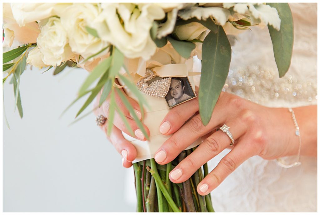 Kathryn had a photo of her late father and a brooch from Matt’s grandmother attached to her bouquet. This is another sweet way to remember passed loved one’s on your wedding day.