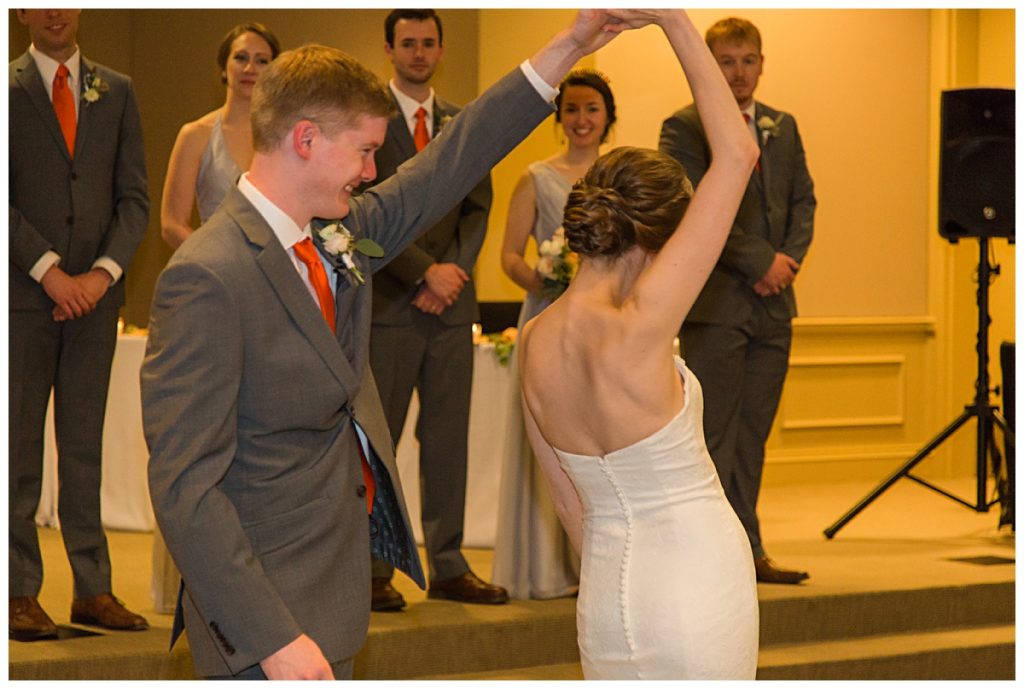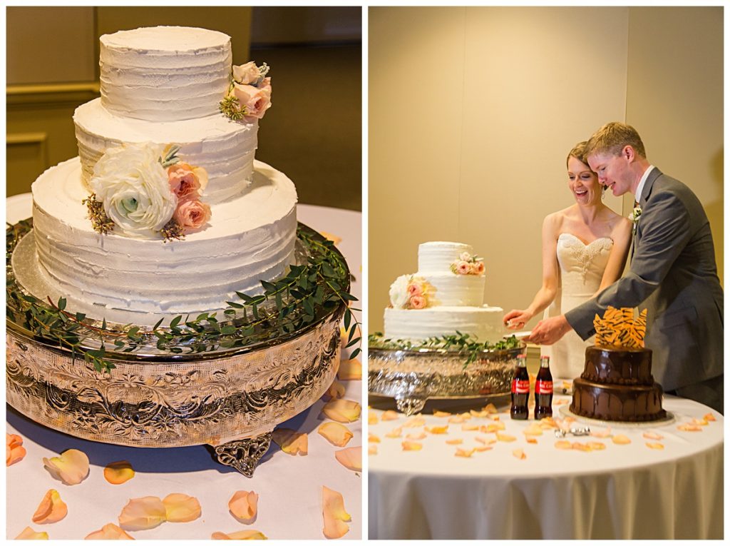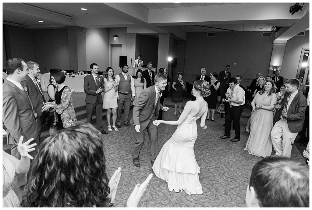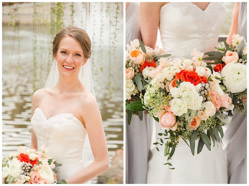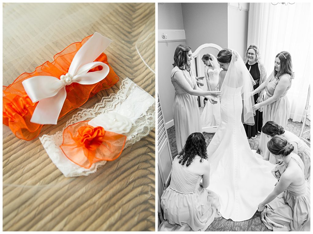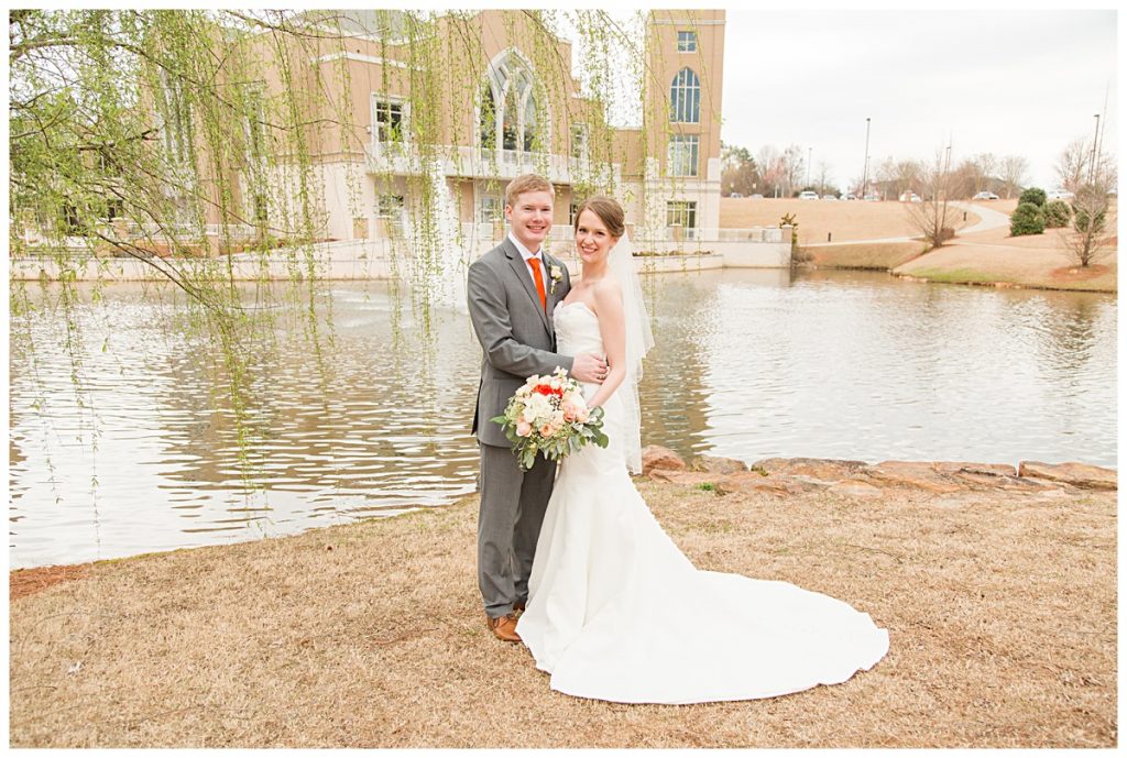 The Bridesmaids’ bouquets were expertly arranged with light pastels and bold orange roses by Brides and Blooms florist. They were the perfect compliment to the Clemson orange ties and socks sported by Wythe and his groomsmen!